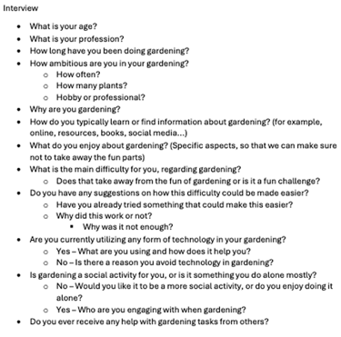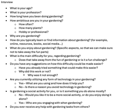 We knew from the start that we wanted to foster a human–plant connection. To define who we were designing for, we alternated between broad reading (scanning across HCI, and gardening studies), narrowing insights, and then doing focused deep dives. A back-and-forth that helped us sharpen the audience and the problem. This process led us to focus on individuals aged 60+ who do indoor gardening as a hobby. The literature consistently links gardening to significant mental and physical health benefits for older adults, and also notes that many people 60+ have more time for hobbies as children move out and retirement approaches. Recognizing that this group can include users with varied levels of digital confidence (without assuming limited ability), we set early design principles around approachable interactions, clear language, and low-friction onboarding.